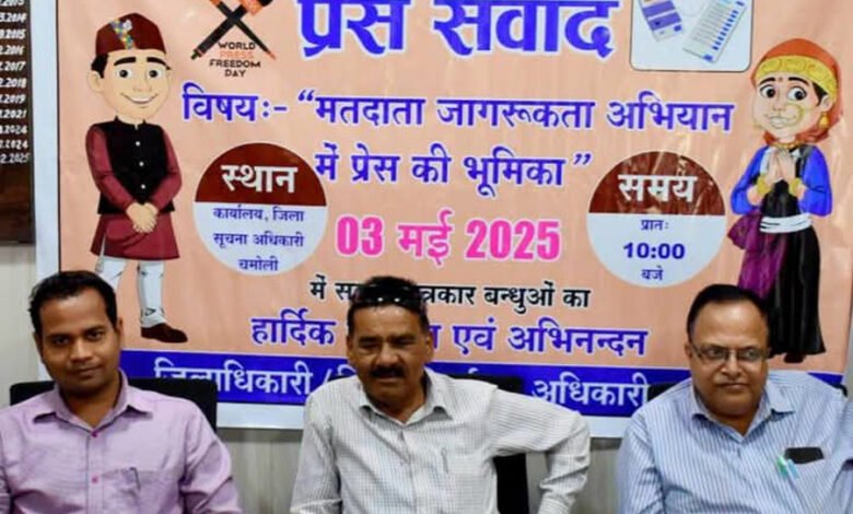 चमोली। अंतरराष्ट्रीय प्रेस दिवस के अवसर पर जिला सूचना कार्यालय गोपेश्वर में प्रेस संवाद कार्यक्रम आयोजित किया गया। कार्यक्रम में मतदाता जागरूकता अभियान में प्रेस की भूमिका को लेकर संवाद किया गया। इस दौरान प्रेस प्रतिनिधियों को मतदाता जागरूकता को लेकर शपथ दिलायी गयी और मतदान प्रक्रिया को बेहतर बनाने को लेकर प्रेस प्रतिनिधियों ने सुझाव भी लिए गए।