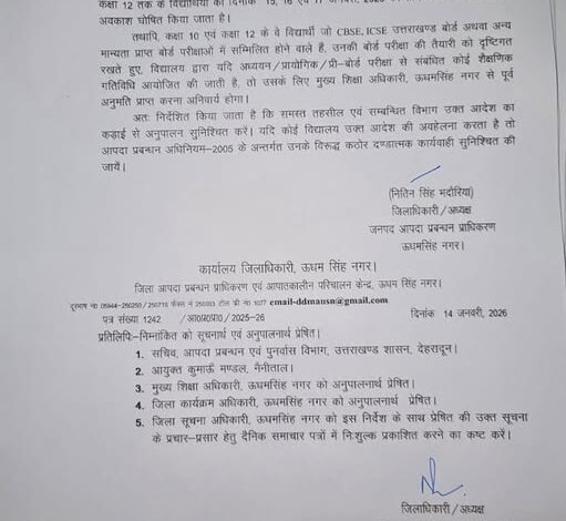शीतलहर की गंभीर स्थिति के पूर्वानुमान को देखते हुए जिलाधिकारी, ऊधमसिंह नगर द्वारा जनपद में एहतियातन महत्वपूर्ण निर्णय लिया गया है। जिलाधिकारी के आदेशानुसार जनपद के समस्त आंगनबाड़ी केंद्रों एवं कक्षा 1 से 12 तक के सभी सरकारी, अशासकीय एवं निजी विद्यालयों में दिनांक 15 जनवरी से 17 जनवरी 2026 तक अवकाश घोषित किया गया है।