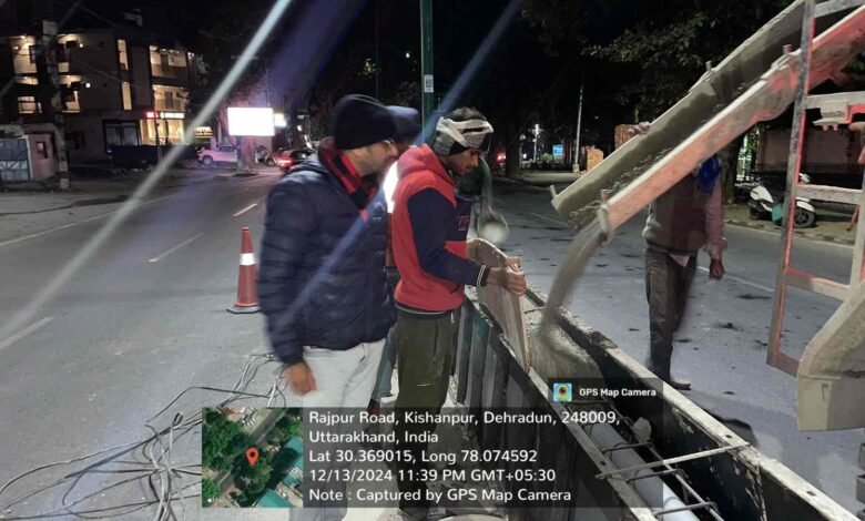 राजपुर रोड में युद्ध स्तर पर डिवाइडर के निर्माण कार्य। डिवाइडर के ऊपर लगाए जाएंगे स्टील रेलिंग।