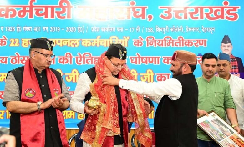 देहरादून। मुख्यमंत्री पुष्कर सिंह धामी ने आज मुख्य सेवक सदन, देहरादून में उपनल कर्मचारी महासंघ द्वारा आयोजित धन्यवाद/अभिनन्दन समारोह में प्रतिभाग किया। इस अवसर पर उपनल कर्मचारी महासंघ द्वारा उपनल कर्मियों के नियमितीकरण के लिए ठोस नीति बनाए जाने की घोषणा पर मुख्यमंत्री का आभार व्यक्त किया। मुख्यमंत्री ने उनका अभिनंदन किए जाने पर सभी उपनल कर्मचारियों को धन्यवाद अर्पित करते हुए कहा कि इस अभिनंदन की हकदार प्रदेश की सवा करोड़ जनता भी है, जिन्होनें उन्हें प्रदेश की सेवा करने का अवसर दिया है। उन्होंने कहा राज्य सरकार एक ठोस और प्रभावी नीति बनाकर जल्द ही उपनल के कर्मचारियों को नियमित करने का कार्य प्रारंभ करेगी। जिसे चरणबद्ध तरीके से तय समय सीमा के अंदर किया जाएगा। उन्होंने कहा इस नियमितीकरण प्रक्रिया से उपनल कर्मचारियों की आर्थिक स्थिति में सुधार होगा एवं उनके भीतर आत्मसम्मान की भावना और भी अधिक प्रगाढ़ होगी। मुख्यमंत्री ने कहा कि कई वर्षों से उपनल के अधिकारी, कर्मचारी निष्ठा और ईमानदारी से कार्य करते हुए अपनी जिम्मेदारियों का निर्वहन कर रहे हैं।