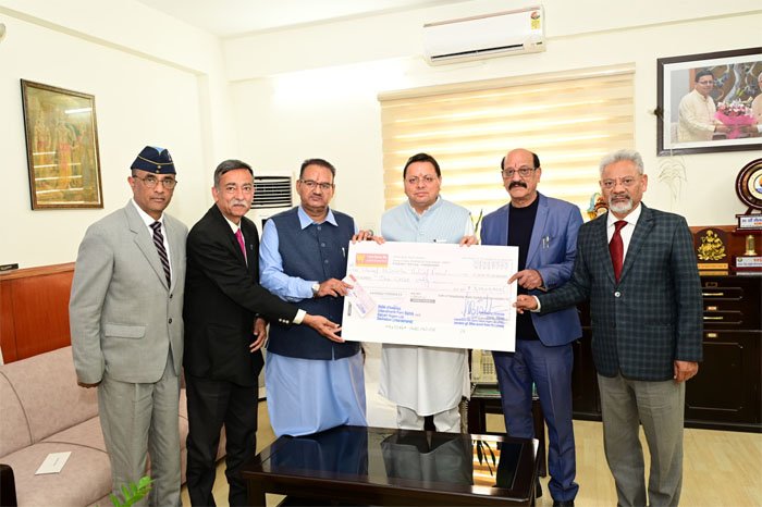 देहरादून। उत्तराखंड के सैनिक कल्याण मंत्री गणेश जोशी ने आज सचिवालय में मुख्यमंत्री पुष्कर सिंह धामी को उत्तराखंड पूर्व सैनिक कल्याण निगम लिमिटेड (उपनल) से एक करोड़ रुपये की धनराशि का चैक मुख्यमंत्री राहत कोष के लिए प्रदान किया। गौरतलब है कि बीते शनिवार को उपनल के 21वें स्थापना दिवस के अवसर पर सैनिक कल्याण मंत्री गणेश जोशी ने इस धनराशि को मुख्यमंत्री राहत कोष में देने की घोषणा की थी। इसी क्रम में आज सचिवालय स्थित मुख्यमंत्री कार्यालय में उन्होंने औपचारिक रूप से यह चेक मुख्यमंत्री पुष्कर सिंह धामी को सौंपा। इस अवसर पर कैबिनेट मंत्री सुबोध उनियाल, उपनल के चेयरमैन मेजर जनरल (सेनि) सम्मी सभरवाल, प्रबंध निदेशक बिग्रेडियर (सेनि) जेएनएस बिष्ट, उप महाप्रबंधक वित्त कर्नल (सेनि) राजेश नेगी उपस्थित रहे।
