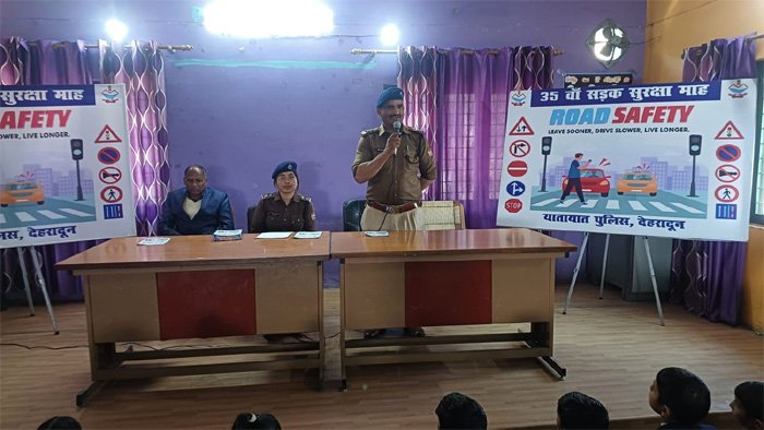 वर्तमान में सम्पूर्ण भारत में आम जन को यातायात नियमो के प्रति जागरूक करने के लिए चलाये जा रहे सडक सुरक्षा माह के अन्तर्गत दून पुलिस द्वारा आज स्कूली छात्र छात्राओं के मध्य जाकर यातायात नियमो के प्रति जागरूकता अभियान चलाया गया। अभियान के दौरान पुलिस लाईन स्थित पुलिस मार्डन स्कूल में आईटीडीए की टीम द्वारा उपस्थित छात्र-छात्राओं को यातायात नियमों तथा सड़क सुरक्षा के सम्बन्ध में विस्तृत जानकारी प्रदान करते हुए यातायात से सम्बन्धित रोड़ साइन (यातायात चिन्हों) के महत्व को विस्तृत रूप से समझाया गया, साथ ही पैदल रोड पार करने के दौरान अपनाई जानी वाली सावधानियों तथा रात्रि में वाहन चलाते समय लो बीम के प्रयोग के सम्बन्ध में जागरूक किया गया।
